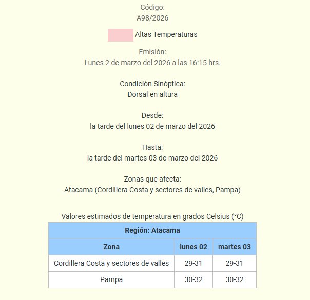Un aviso por altas temperaturas fue emitido para distintos sectores de la Atacama, fenómeno que se extenderá desde la tarde del lunes 2 hasta la tarde del martes 3 de marzo, bajo la influencia de una dorsal en altura.