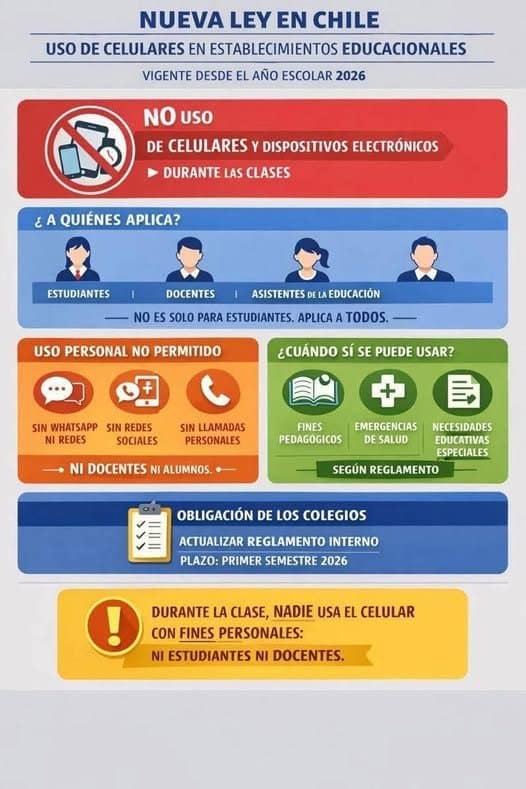 Desde el inicio del año escolar 2026, comenzó a aplicarse en Chile la ley que prohíbe y regula el uso de celulares y otros dispositivos con acceso a internet en establecimientos de educación parvularia, básica y media, tanto para estudiantes como para integrantes de la comunidad educativa durante actividades curriculares.